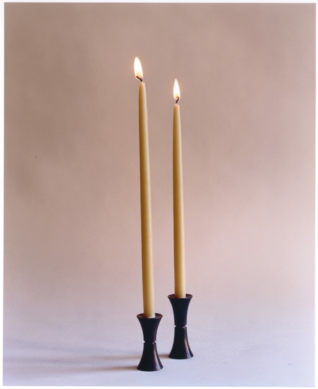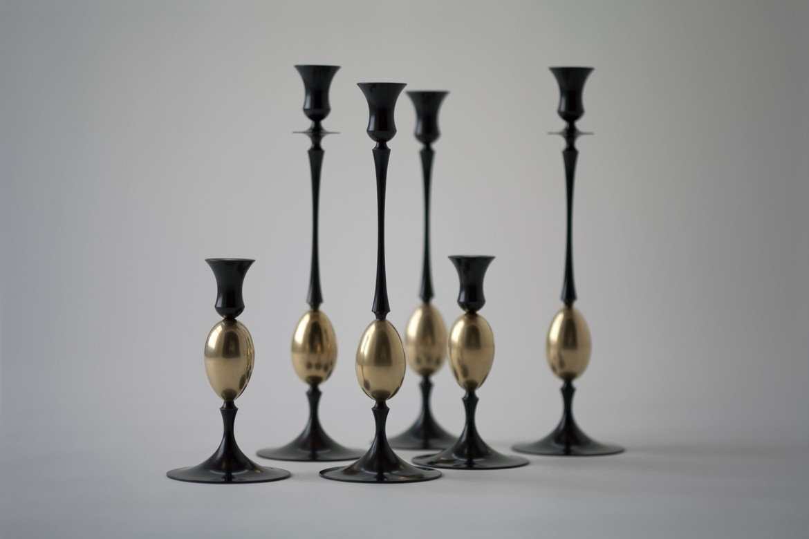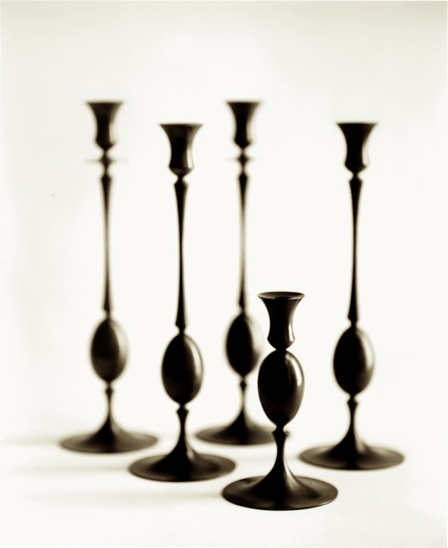 The candlesticks are based on three basic shapes: the egg, an attenuated rod, and a trumpet form. Permutations of these convex and concave shapes have yielded 5 different pieces. By combining and varying these, Muehling has created 17 different candlesticks that can be used individually, in symmetrical pairs, or in groupings of 3 or more. They are available in burnished brass, oxidized bronze, polished or pumiced sterling silver plate, or pumiced 24k gold plate. The darkened bronze accentuates the silhouette, emphasizing a neoclassical origin, while polished or pumiced surfaces enhance the play of light on the forms.